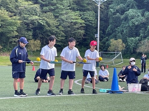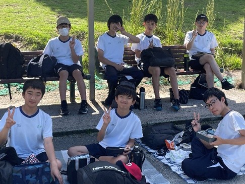 東郷運動公園に行き、多目的広場でクイズやグラウンドゴルフ、ボール送りリレーなどのレクレーションを行いました。4つの縦割りチームに分かれて行い、学年関係なくチームメイトを応援する様子が見られ、親睦を深めました。
