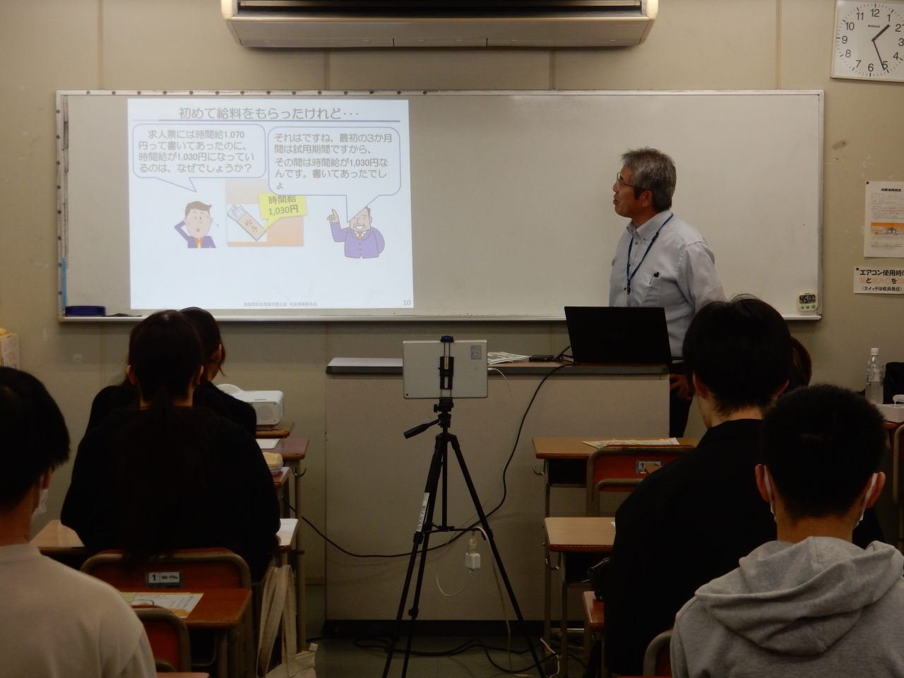 10月19日(日)、通信制出前授業を実施いたしました。当日は、鳥取県社会保険労務士会の板倉剛氏をお招きし、通信制高3生を対象として、「知っておきたい働くときの基礎知識」を授業していただきました。板倉氏は、長年の経験から就職の基礎知識について、ご自身のエピソードを交えつつ、また最近の話題も盛り込みながら分かりやすく話されました。今後、社会人になる意識づけとして有意義な時間となりました。