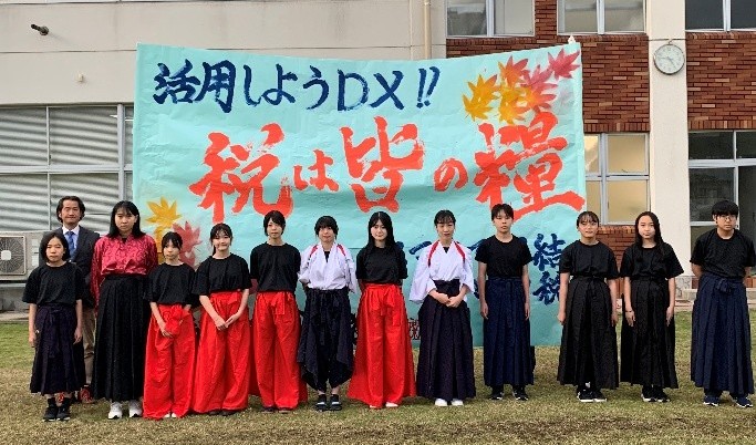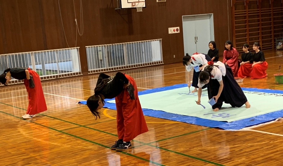 10月27日(月)に本校グラウンドと体育館で、書道部による書道パフォーマンスと租税教育推進協議会への作品交付式が行われました。あいにくの天気でしたが、多くの在校生に見守られながらグラウンドで交付式を実施することができ、作品・パフォーマンスも高い評価を受けました。