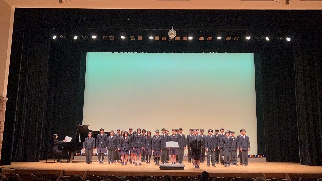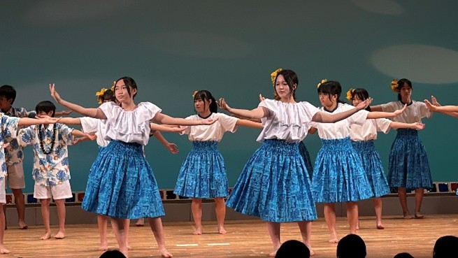 本校の中1生とフラ部がフラを、中2生と合唱部が合唱を、更に剣道部が日本剣道形を披露しました。会場は、大きな拍手で盛り上がり、日ごろの練習の成果と地域との関わりの大切さを感じた感謝の一日となりました。