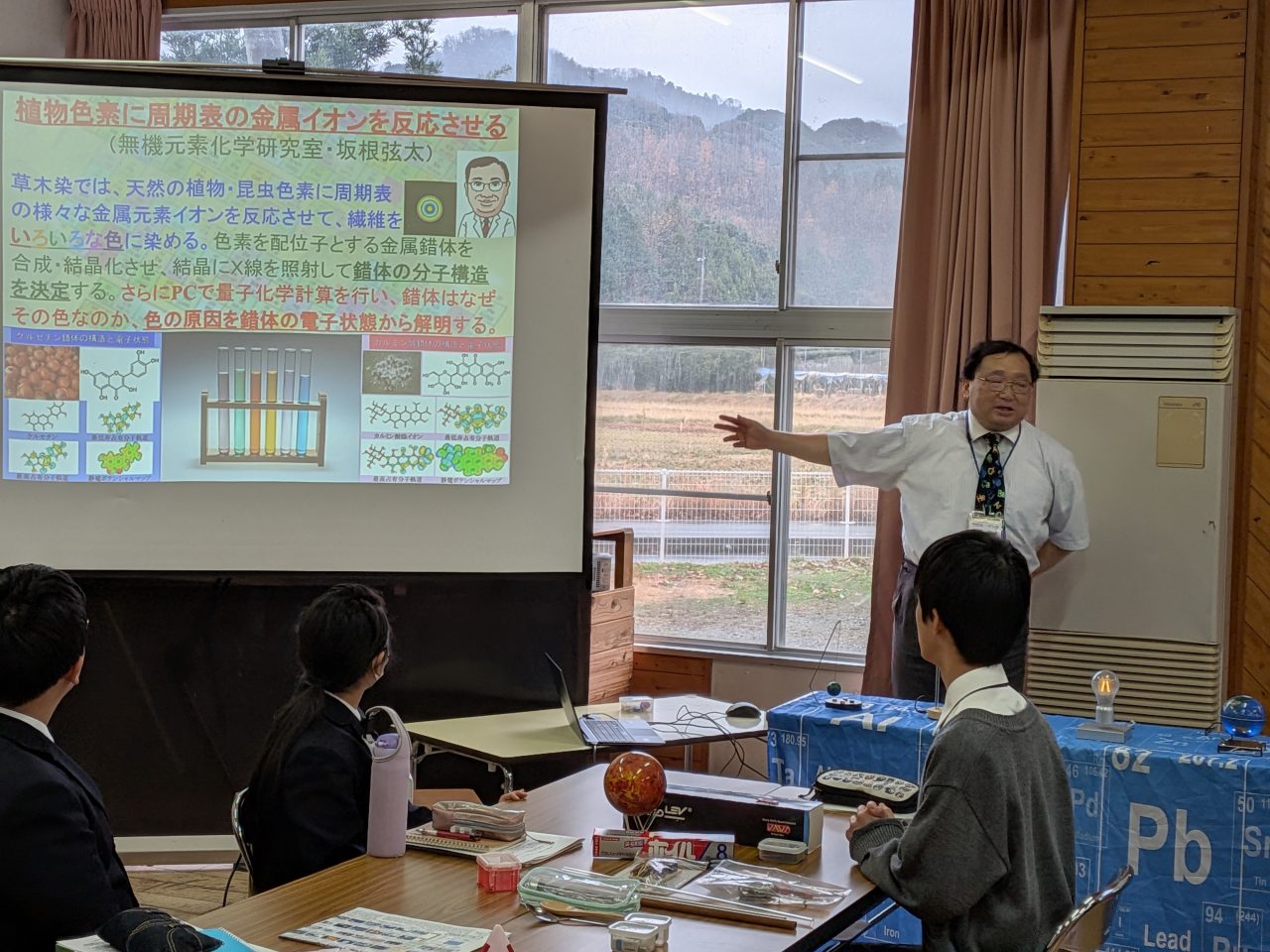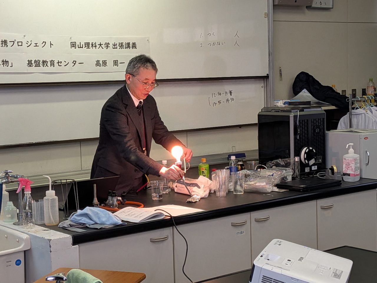 12月24日(水)に中学2年生を対象として、岡山理科大学の先生お二人に出張講義を行っていただきました。このプロジェクトは、理科の学習内容が身近な生活でどのように活用されているのか、またどのような原理で実用化されているのかを知ることで、「科学的思考力」、「論理的思考力」などを育成することを目的としています。