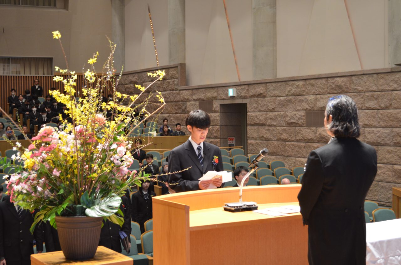 卒業生答辞では、周囲の方々への感謝と共に、中学高校6年間の思い出を辿りながら、クラスメイトとの絆、在校生へのメッセージ、未来への決意を述べました。